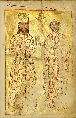 ![]() Мануил Асен и съпругата му. Миниатюра от Устава на Теодора Синадина, XIV в. | |