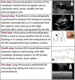 - ↑ a b c d e f g «Temporary Transvenous Cardiac Pacing • LITFL • CCC». Life in the Fast Lane • LITFL. 30 de janeiro 2019. Consultado em 19 de março 2021. Arquivado do original em 23 de janeiro 2021