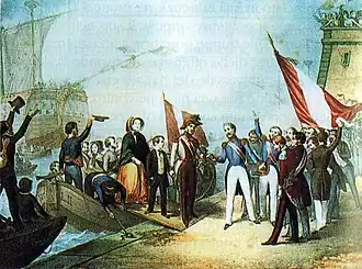 Em 30 de janeiro de 1849, foi necessária a assinatura do Grão-Duque no Senado para aprovar a nova tendência política: Leopoldo II, que não queria continuar a guerra, deixou Florença e seguiu para Siena, de onde resolveu partir: Maria Antônia partiu com os filhos mais novos, Luísa e Luís; Fernando e Carlos partiram com seu cavaleiro de companhia; Leopoldo saiu com a irmã, a cunhada e as filhas Isabel e Cristina. A família se reuniu na planície de Rosìa e depois se separou novamente em Maremma: Leopoldo e seus filhos adultos embarcaram em Talamone para ir a Porto Santo Stefano, Maria Antônia e as crianças seguiram para Orbetello. Chegando à cidade, a grã-duquesa foi atacada pelas pessoas que queriam mantê-la junto com seus filhos, que caíram em prantos; a intervenção de um caçador do grão-duque permitiu que a grã-duquesa continuasse e chegasse ao navio do marido. Enquanto isso, em 9 de fevereiro, em Florença, foi estabelecido um triunvirato composto por Guerrazzi, Montanelli, Mazzoni, que redigiu uma nova constituição e proclamou a República em 15 de fevereiro.