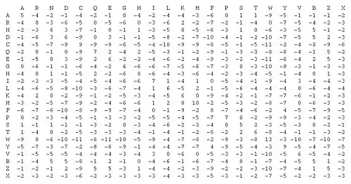 Este tipo de matrizes são mais usuais nos alinhamento de sequências de aminoácidos (proteínas) que nos de nucleotídeos (ADN), já que neste último caso um sistema de pontuação muito mais simples é geralmente usada para o emparelhamento entre os quatro diferentes nucleotídeos e geralmente atribui uma pontuação positiva para a coincidência no emparelhamento, uma pontuação nula ou negativa para a incompatibilidade e uma pontuação negativa para as lacunas ou gaps.[2]