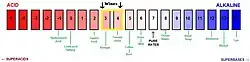 O nível de pH de um vinho é a medida da quantidade de íons de hidrogênio livres (H+). Ele está relacionado ao nível de acidez titulável de um vinho, mas difere de forma significativa. Números baixos de pH indicam uma alta concentração de ácidos em uma solução. Enquanto a água pura é neutra, com um pH de 7, o vinho tende a ser mais ácido, com um pH entre 3 e 4. À medida que os níveis de acidez nas uvas em amadurecimento caem, a concentração de ácidos diminui, o que significa que o nível de pH está aumentando. Leveduras, bactérias e compostos fenólicos, como as antocianinas, que influenciam a cor, têm tolerância variável a vinhos com altos níveis de pH. Em geral, os vinhos com alto valor de pH tendem a ter cores mais opacas e sabores menos desenvolvidos, além de serem mais propensos a falhas no vinho causadas por organismos de deterioração, o que torna o monitoramento dos níveis de pH das uvas durante o amadurecimento uma prioridade para viticultores e vinicultores.[2]