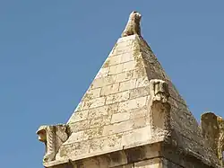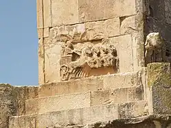 Na face norte do pódio, o primeiro dos três níveis, uma abertura coberta por uma laje leva à câmara funerária. Os outros rostos do mausoléu estão decorados com aberturas falsas, os cantos com pilastras eólicas.