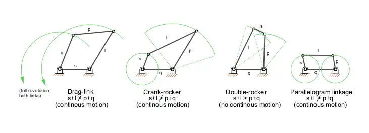 A Lei de Grashof é uma fórmula utilizada para analisar o tipo de movimento que fará o mecanismo de quatro barras: para que exista um movimento contínuo entre as barras, a soma da barra mais curta e a barra mais longa não pode ser maior que a soma das barras restantes.