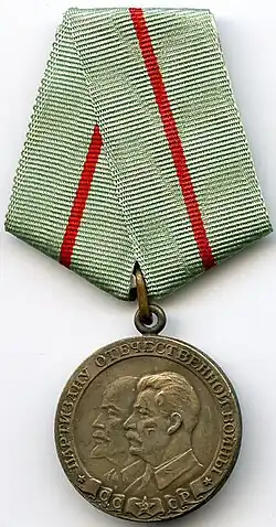 Inicialmente, a fita foi fixada com 20 mm de largura, de cor verde claro com listras estreitas ao longo das bordas, cada uma com 2 mm de largura: vermelha para a medalha de 1ª classe e azul para a medalha de 2ª classe [2]. Por decreto de 19 de junho de 1943, foi instituída uma nova fita - 24 mm de largura, de cor verde claro com uma faixa longitudinal no meio de 2 mm de largura: vermelha para a medalha de 1ª classe e azul para a medalha de 2ª classe [10].