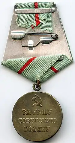 No verso da medalha está a inscrição “PELA NOSSA PÁTRIA SOVIÉTICA” (em russo: «ЗА НАШУ СОВЕТСКУЮ РОДИНУ»; «ZA NASHU SOVETSKUYU RODINU») em três linhas, acima da qual está a imagem de uma foice e um martelo.
