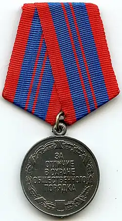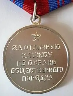 - ↑ a b c «ПРЕЗИДИУМ ВЕРХОВНОГО СОВЕТА СССР УКАЗ от 1 ноября 1950 года ОБ УЧРЕЖДЕНИИ МЕДАЛИ "ЗА ОТЛИЧНУЮ СЛУЖБУ ПО ОХРАНЕ ОБЩЕСТВЕННОГО ПОРЯДКА"» [Decreto do Presidium do Soviete Supremo da URSS de 1º de novembro de 1950 Sobre a instituição da medalha "Pelo serviço distinto na proteção da ordem pública"] 🔗. libussr.ru (em russo). Biblioteca jurídica da URSS. 1º de novembro de 1950. Consultado em 16 de setembro de 2025