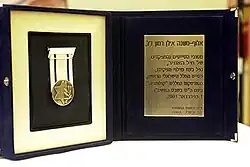 | Descritivo | Medalha de prata redonda com a Estrela de Davi, espada e ramo de oliveira com fita azul-claro e branca |