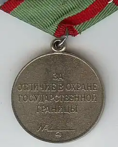 Por decreto do Presidium do Soviete Supremo da URSS de 13 de julho de 1950, foi instituída a medalha “Por Distinção na Guarda da Fronteira Estatal da URSS”. Ela destinava-se a condecorar militares das tropas de fronteira, bem como outros militares e cidadãos soviéticos por méritos demonstrados na proteção das fronteiras do país. O desenho da medalha foi elaborado pelo artista P. M. Vremenko.[1] Segundo o pesquisador e candidato em ciências jurídicas M. A. Rogov, a medalha tinha ligação direta com os órgãos de assuntos internos, já que, entre 1953 e 1957, as tropas de fronteira faziam parte da estrutura do Ministério de Assuntos Internos da URSS.[2][3]