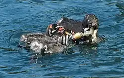 Os mergulhões jovens podem deixar o ninho um dia após a eclosão. A pele amarela é vista entre o loro e o topo da cabeça.[12] Não nadam bem e ficam fora da água. Dormem nas costas dos pais. Em quatro semanas, começam a nadar.[13] Ambos os pais compartilham o papel de criar os filhotes – alimentando-os e carregando-os nas costas.[15] Às vezes, os pais mergulham debaixo d'água para buscar comida com os filhotes nas costas.[12]