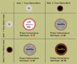 Merle é na verdade um heterozigoto de um gene incompletamente dominante.[8] Se dois desses cães forem acasalados, em média, um quarto dos filhotes será "merle duplo", que é o termo comum para cães homozigotos de merle,[9] e uma alta porcentagem desses filhotes pode ter defeitos oculares e/ou surdez. Criadores experientes e responsáveis que querem produzir filhotes merle, acasalam um cão merle com um cão não-merle; cerca de metade dos filhotes serão merle e nenhum deles terá defeitos de visão ou de audição associados a cães duplo merle.[10]