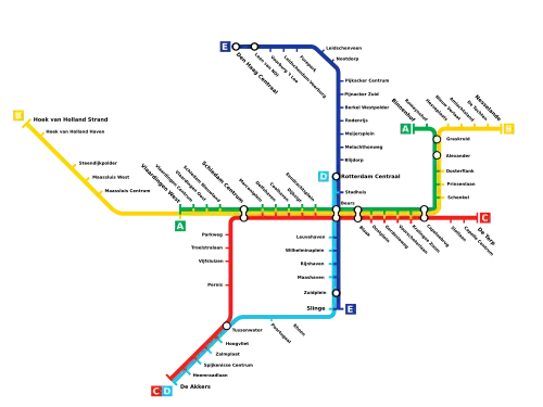 Em 2006, a antiga linha ferroviária de Hofplein, que havia sido fechada, foi convertida numa nova linha de metro, a linha E, que circulava entre as estações Hofplein e Nootdorp. No final desse ano, a linha foi expandida até Den Haag Centraal. Em 2010, a linha foi expandida através de um túnel à estação de Rotterdam Centraal, e no ano seguinte começou a circular juntamente com a linha D até à estação de Slinge. Esta nova linha é operada em conjunto com a RandstadRail.[6]