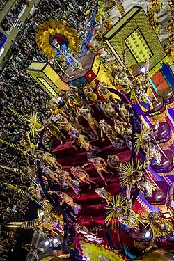 | Alegoria 2: "O Mercado de Gente" A segunda alegoria do desfile fez referência ao tráfico de escravos praticado pelos muçulmanos árabes do norte e leste da África. Segundo o enredo, pessoas de vários grupos raciais foram forçadas à escravidão, incluindo uma grande parcela de povos europeus da costa mediterrânea e das regiões montanhosas do Cáucaso. Na frente da alegoria, duas esculturas de leões dourados e um chafariz, simbolizaram o poder e realeza do califado. No centro da alegoria, quarenta componentes representaram escravizados cercados por 28 componentes representando sentinelas do califado. ![]() Leão direito: Luiz Vigneron Moon com a fantasia "Sentinela do Califado". Leão esquerdo: Fábio Lima com a fantasia "Sentinela do Califado". Destaque central alto: Flávio Rocha com a fantasia "Grande Califa". No chafariz: Graciele Chaveirinho com a fantasia "Concubina do Califa". Composições: 40 componentes com a fantasia "Escravos mediterrâneos". 28 componentes com a fantasia "Sentinelas árabes". |