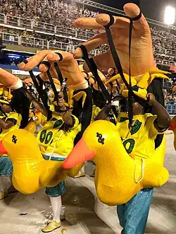 ![]() A última alegoria do desfile foi dividida em dois níveis para evidenciar a desigualdade social no Brasil. Na parte de baixo, a classe trabalhadora foi poeticamente colocada no lugar dos antigos escravizados. Na parte de cima, a reprodução de um saco de dinheiro e moedas de ouro, simbolizando a "classe dominante" formada pelos ricos e poderosos que, segundo o enredo, "extrai e concentra cada vez mais as riquezas geradas pelo trabalho do povo e se articula, econômica e politicamente, para sua manutenção e de seus privilégios". Na parte frontal do carro alegórico, a reprodução de uma mão gigante acorrentada simbolizando, segundo o roteiro do desfile, "que o antigo regime exploratório dos ricos sobre os pobres avança em golpeantes reformas". Na lateral da alegoria, a reprodução de mãos saindo de ternos, simbolizando a manipulação do povo por parte dos "poderosos", seguindo a ideia da última ala. ![]() Destaque central médio: Samile Cunha com a fantasia "Quem É o Pato?", satirizando a campanha da FIESP. Destaque central alto: Léo Morais com a fantasia "Vampiro Neoliberalista", uma possível referência ao então presidente do Brasil, Michel Temer. Composições: 38 componentes com fantasias variadas de trabalhadores como médicos, garis e operários. Oito componentes com a fantasia "Manifestoches", semelhantes à ala 29. Dezoito componentes com a fantasia "Golpresários". Seis componentes com a fantasia "Vampiresários". |