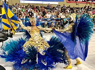 Ala 17 (Bateria): "Feitores"![]() Rainha de Bateria (Carol Marins): "Espírito Quilombola" A rainha de bateria, Carol Marins, desfilou com fantasia dourada com costeiro de plumas azuis e penas de faisão preto, simbolizando o "espírito quilombola" dos escravizados que sonhavam com a liberdade. |
