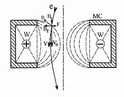 Representação esquemática do funcionamento das lentes magnéticasLentes condensadoras: Um conjunto de diferentes lentes eletromagnéticas e aberturas permitem a análise de um feixe paralelo empregado em TEM ou a análise de um feixe convergente utilizado na microscopia de transmissão e varredura (STEM). As lentes magnéticas são bobinas através das quais passa o feixe de elétrons. Quando uma corrente elétrica passa pela bobina, é gerado um campo magnético que colima o feixe. A corrente elétrica gera calor, sendo necessário um sistema de resfriamento para esse tipo de lente. Diferentemente da lente de vidro, a lente magnética muda a distância de foco, de acordo com o campo magnético. [8]