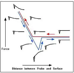 Ao aproximar o tip perto o suficiente de sua amostra, surge uma diferença de energia potencial V entre ambas. Essa diferença promove uma força F que leva a deflexão do cantiléver. Essa força F é utilizada como sinal para a imagem e é devida as interações de van der Waals entre o tip e a amostra, o cantiléver oscila dentro de um regime repulsivo com a amostra.[6]