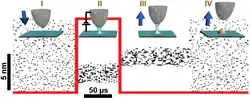 Para utilizar essa técnica é necessário uma ponteira extremamente dura. É feita uma identação na amostra e o aparelho faz o percurso desejado, conforme a ponteira vai se movendo, a amostra é sendo litografada ("arranhada").[24][25] Pode-se fazer uma analogia com um campo sendo arado. O tip vai "arranhando" (identando) a superfície de maneira análoga a um arado esculpindo o solo, de modo que padrões podem ser desenhados dessa maneira.