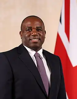 O advogado David Lammy, filiado ao Partido Trabalhista, atualmente ocupa o cargo de Secretário do Exterior britânico desde sua nomeação pelo Primeiro-ministro Sir Keir Starmer em 5 de julho de 2024.[6]