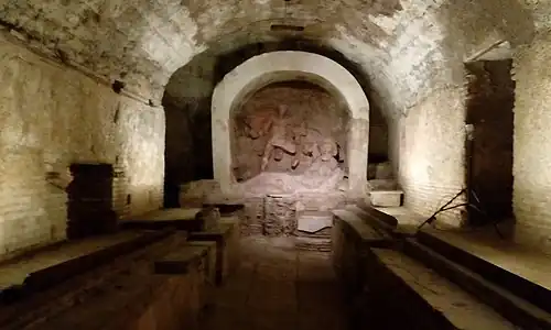 Depois da cripta da igreja, o próximo recinto é conhecido como "ambiente V", uma espécie de átrio do mitreu mais mantigo que depois foi integrado alargando a porta de acesso e construindo grandes bancos nas laterais[1].