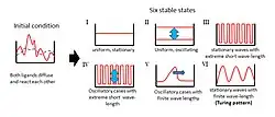 - Ocorrem padrões estacionários, com comprimento de onda finito. Estes são a grande descoberta de Turing e apropriadamente intitulados de Padrões de Turing. Este padrão de onda não-linear e seu comprimento de onda é regulado por um equilíbrio entre diversas propriedades do sistema, como velocidade de produção das moléculas envolvidas, velocidade de difusão, velocidade de reação e velocidade de degradação destas. A capacidade de auto-regeneração do padrão após distúrbios induzidos em laboratório corroboram a robustez e validade do modelo nas observações.[12][13]
