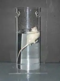 - Teste de natação forçada:[9] O teste de natação forçada (FST, do inglês Forced-swimming test) é baseado na observação de que os animais desenvolvem uma postura imóvel em um cilindro inescapável cheio de água. Neste teste, a imobilidade é interpretada como uma estratégia passiva de enfrentamento do estresse ou comportamento semelhante à depressão (desespero comportamental). Após a administração do antidepressivo, os animais realizarão ativamente comportamentos direcionados à fuga com maior duração do que os animais com tratamento com solução salina de controle. O FST é a ferramenta mais utilizada na pesquisa da depressão, mais especificamente como triagem para antidepressivos agudos.