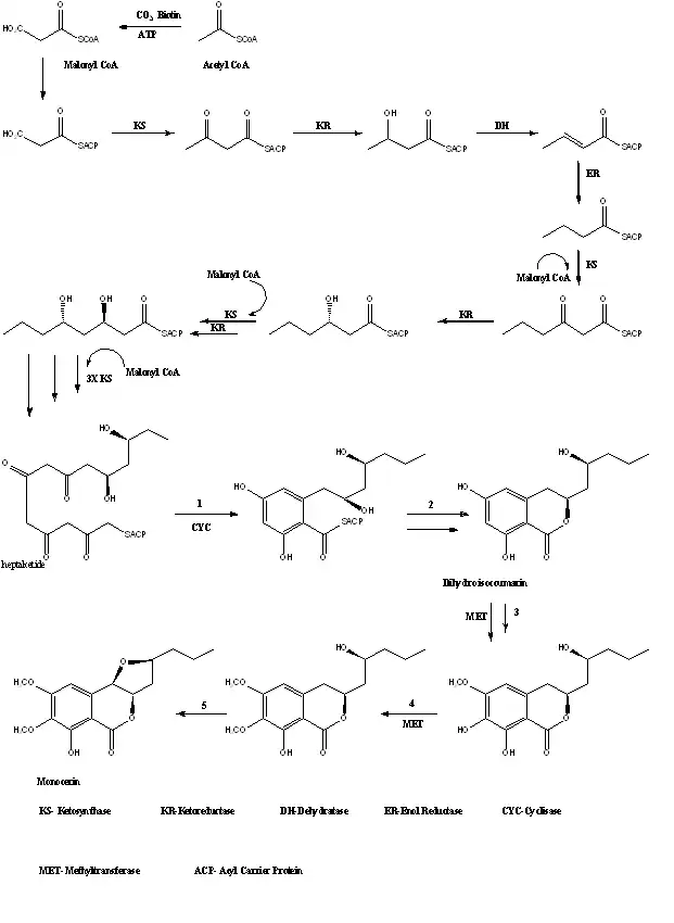Policétido sintases (PKSs) dos fungos são PKSs do tipo I. A monocerina foi confirmada por estudos de biossíntese como tendo origens heptacétidas. Monocerina PKS produz um intermediário com inicialmente um alto grau de modificação redutiva, mas termina com uma clássica porção molecular de β-policetídeo. Di-hidroisocumarina é o primeiro intermediário livre de PKS que seria formado a partir do heptacetídeo reduzido cuja via de montagem é mostrada na figura 1.[2] Cetossintase, cetoredutase, desidratos, enol redutases e ciclisases são mostradas como domínios do monocerina PKS e a metil transferase é considerada uma enzima de adaptação.[3]