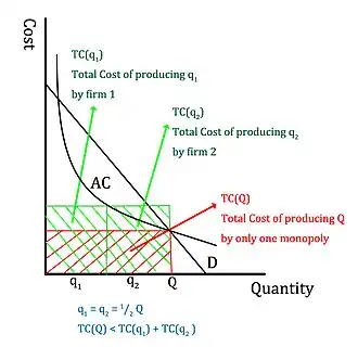 Uma vez estabelecido um monopólio natural devido ao grande custo inicial e que, de acordo com a regra das economias de escala, a corporação maior (até certo ponto) tem um custo médio inferior e, portanto, uma vantagem sobre seus concorrentes. Com esse conhecimento, nenhuma empresa tentará entrar no setor e um oligopólio ou monopólio se desenvolverá.