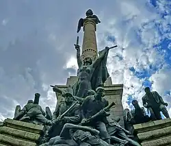 É composta por um pedestal, de 45 m de altura, rodeado de grupos escultóricos, chegando mesmo, dois deles, a morder a base. Estes, representam cenas de artilharia em movimento, podendo ver-se também soldados ingleses que vieram apoiar Portugal e a intervenção das gentes do povo na luta e o desastre da «Ponte das Barcas». De notar a presença do elemento feminino em todos os grupos: no da frente, uma mulher, a Vitória guiando o povo, empunha, na mão esquerda, a bandeira nacional e, na direita, uma espada.