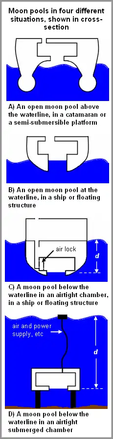 Moon pools podem ser utilizadas em câmaras abaixo do nível do mar, especialmente para o uso de mergulhadores, e o seu projeto exige uma consideração mais complexa da pressão do ar e da água atuando na superfície da moon pool.