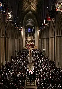 Em torno de 4 mil pessoas reuniram-se na Catedral Nacional de Washington para assistir ao serviço fúnebre, incluindo o Presidente George W. Bush e a Primeira-dama Laura Bush e seus pais George H. W. e Barbara Bush. Outros ex-presidentes e ex-primeiras-damas também estavam presidentes, como Gerald e Betty Ford, Jimmy e Rosalynn Carter e Bill e Hillary Clinton. Membros do Congresso dos Estados Unidos e governadores estaduais também marcaram presença.