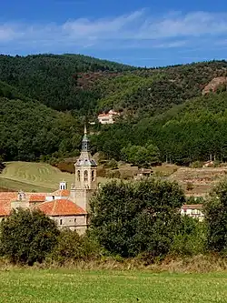 A igreja é de três naves, com abóbada estrelada e zimbório. Começou em 1504 por mandato do abade Frei Miguel de Alzaga e rematou trinta e seis anos depois. A igreja era para uso dos monges, por isso a parte dianteira, desde o coro central passando pelo presbitério até ao relicário, era destinada somente para eles. A parte traseira, do atrás-coro até a porta era a zona que usava o povo quando podia aceder ao templo. São dois espaços litúrgicos dentro do mesmo edifício.