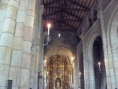 De planta basilical, divide-se em três longas naves, com a central mais larga que as laterais, e que se alçam a grande altura, suportadas por pilares quadrados com uma coluna acaroada e coroadas por capitéis de simples ornamentação vegetal, a imagem dos pilares da Sé compostelana. Destaca-se a existência de um trifório, elemento arquitetônico nada usual no românico galego da ordem.