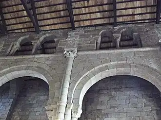 A nave central tem 36 metros de comprimento e aproximadamente 12 de altura. As naves cobrem-se com um telhado com armação de madeira. As janelas configuram-se com arcos de meio ponto sustentados por duas colunas com capitéis com diversas representações (touros, patos, cavalos e monstros alados com cabeça de leão, etc.).