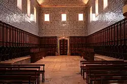 O coro das monjas, com o seu maravilhoso cadeiral de 106 assentos, apresenta-se revestido por azulejos de padrão azuis e brancos, encontrando-se, no topo oriental, o já mencionado portal manuelino em cantaria, de arco polilobado, ornamentado com motivos vegetalistas e heráldicos.