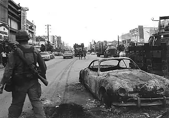 ![]() Militar norte-americano perto de um Volkswagen Karmann-Ghia queimado em Koza, horas depois do motim. | |