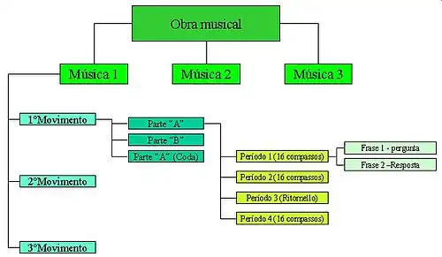 No caso, a escolha do sistema da composição é do compositor, este exemplo foi bastante comum do período barroco ao romântico. Neste caso, A obra tem 3 músicas, cada qual com 3 movimentos, cada um deles com 3 partes e cada parte com 4 períodos (de 16 compassos cada: uma peça muito curta) cada qual com duas frases musicais. Poderíamos usar este sistema para exemplificar, por exemplo, a obra As Quatro Estações de Vivaldi: cada concerto (primavera, verão, outono, inverno) possui três movimentos, onde cada um deles é uma música completa. Neste caso (o mais comum) o 1º é rápido, o 2º é lento e o 3º é rápido.