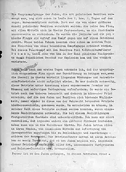 Quando invadimos o Gueto pela primeira vez, os judeus e os bandidos polacos conseguiram repelir as unidades participantes, incluindo tanques e carros blindados, através de uma concentração de fogo bem-preparada. (...) O principal grupo de batalha judeu, misturado com bandidos poloneses, já havia se retirado durante o primeiro e segundo dia para a chamada Praça Muranowski. Lá, foi reforçado por um número considerável de bandidos polacos. Seu plano era controlar o Gueto por todos os meios para evitar que o invadíssemos. (...) Repetidas vezes, os bandidos polacos encontraram refúgio no Gueto e aí permaneceram imperturbados, uma vez que não tínhamos forças à nossa disposição para vasculhar este labirinto. (...) Um desses grupos de combate conseguiu montar um caminhão subindo de um esgoto na chamada [Rua Prosta], e escapar com ele (cerca de 30 a 35 bandidos). (...) Os bandidos e judeus – havia bandidos poloneses entre essas gangues armados com carabinas, armas pequenas e, em um caso, uma metralhadora leve – montaram no caminhão e partiram em direção desconhecida.[56]