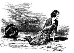 Sob a influência de Goldman e da Liga da Liberdade de Expressão, Sanger tornou-se determinada a desafiar as leis de Comstock que proibiam a disseminação de informações contraceptivas.[36] Com esse objetivo em mente, lançou em 1914 o The Woman Rebel, um boletim informativo mensal de oito páginas que promovia a contracepção usando o slogan "Sem Deuses, Sem Mestres",[c] e proclamou que cada mulher deveria ser "a senhora absoluta de seu próprio corpo."[38] Sanger inventou o termo controle de natalidade, que apareceu nas páginas de seu periódico como uma alternativa mais sincera aos eufemismos, como a limitação familiar.[39][40]