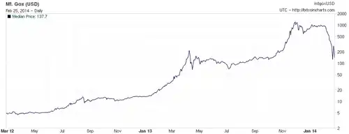 De 1º de fevereiro de 2014 até o final de março, durante o período dos problemas do Mt. Gox, o valor do bitcoin caiu 36%.[66]