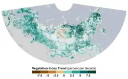 Entretanto, as florestas boreais, especialmente as da América do Norte, apresentaram uma resposta diferente ao aquecimento. Muitas florestas boreais ficaram mais verdes, mas a tendência não foi tão forte quanto a da tundra do Ártico circumpolar, caracterizada principalmente pela expansão dos arbustos e pelo aumento do crescimento.[88] Na América do Norte, algumas florestas boreais realmente ficaram marrons durante o período do estudo. Secas, aumento da atividade de incêndios florestais, comportamento animal, poluição industrial e vários outros fatores podem ter contribuído para o escurecimento.[79]