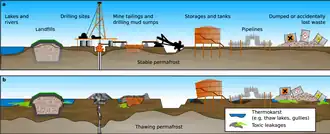 Durante grande parte do século XX, acreditava-se que o permafrost preservaria “indefinidamente” qualquer coisa enterrada ali, o que tornou as áreas profundas de permafrost locais populares para o descarte de resíduos perigosos. Em locais como o campo de petróleo de Prudhoe Bay, no Alasca, foram desenvolvidos procedimentos que documentavam a maneira “apropriada” de injetar resíduos sob o permafrost. Isso significa que, a partir de 2023, há cerca de 4 500 instalações industriais nas áreas de permafrost do Ártico que processam ou armazenam ativamente produtos químicos perigosos. Além disso, há entre 13 000 e 20 000 locais que foram altamente contaminados, 70% deles na Rússia, e sua poluição está atualmente presa no permafrost.