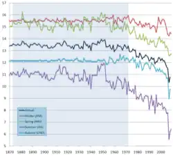 Entretanto, como as observações específicas são consideradas observações de curto prazo, há uma incerteza considerável nas conclusões. As observações climatológicas requerem várias décadas para distinguir definitivamente várias formas de variabilidade natural das tendências climáticas.[163] Esse ponto foi enfatizado por revisões em 2013[164] e em 2017.[165] Um estudo de 2014 concluiu que a amplificação do Ártico diminuiu significativamente a variabilidade da temperatura da estação fria no Hemisfério Norte nas últimas décadas. Atualmente, o ar frio do Ártico penetra mais rapidamente nas latitudes mais baixas e mais quentes durante o outono e o inverno, uma tendência projetada para continuar no futuro, exceto durante o verão, questionando assim se os invernos trarão mais fenômenos extremos de frio.[166] Uma análise de 2019 de um conjunto de dados coletados de 35 182 estações meteorológicas em todo o mundo, incluindo 9 116 cujos registros ultrapassam 50 anos, constatou uma diminuição acentuada nas ondas de frio de latitude média do norte desde a década de 1980.[167]