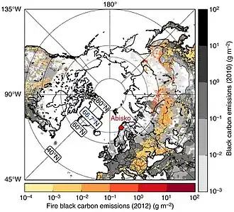 Os depósitos de carbono negro (provenientes da combustão de óleo combustível pesado do transporte marítimo no Ártico) absorvem a radiação solar na atmosfera e reduzem consideravelmente o albedo quando depositados na neve e no gelo, acelerando assim o efeito do derretimento da neve e do gelo marinho.[113] Um estudo de 2013 quantificou que a queima de gás [en] em locais de extração de petróleo contribuiu com mais de 40% do carbono negro depositado no Ártico.[114][115] Uma pesquisa de 2019 atribuiu a maioria (56%) do carbono negro da superfície do Ártico às emissões da Rússia, seguida pelas emissões europeias, e com a Ásia também sendo uma grande fonte.[113][116] Em 2015, uma pesquisa sugeriu que a redução das emissões de carbono negro e de gases de efeito estufa de curta duração em cerca de 60% até 2050 poderia resfriar o Ártico em até 0,2 °C.[117] No entanto, um estudo de 2019 indica que “as emissões de carbono negro aumentarão continuamente devido ao aumento das atividades de transporte marítimo”, especificamente de embarcações de pesca.[118]