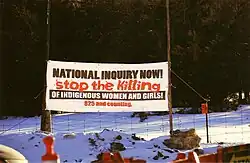Um relatório de 2014 da RCMP, intitulado "Mulheres Aborígenes Desaparecidas e Assassinadas: Uma Visão Operacional Nacional", constatou que mais de 1.000 mulheres indígenas foram assassinadas ao longo de 30 anos.[44] Em resposta aos ativistas, à coleta de dados financiada pelo governo federal sobre mulheres desaparecidas e assassinadas, que encerrou em 2010, a Associação das Mulheres Indígenas do Canadá (NWAC) documentou 582 casos desde os anos 1960, com 39% ocorrendo após 2000.[45] Entretanto, grupos de defesa afirmam que muitas mais mulheres estiveram desaparecidas, com o maior número de casos na Colúmbia Britânica. Casos notórios incluem 19 mulheres assassinadas nas Mortes na Rodovia das Lágrimas, e algumas das 49 mulheres da região de Vancouver assassinadas pelo serial killer Robert Pickton.[25] Em resposta a reiterados apelos de grupos indígenas, ativistas e organização não governamental, o Governo do Canadá, sob o Primeiro-Ministro Justin Trudeau, estabeleceu o Inquérito Nacional sobre Mulheres e Meninas Indígenas Desaparecidas e Assassinadas em setembro de 2016.[23] Segundo o documento de fundo, de 22 de abril de 2016, entre os anos de 1980 e 2012, as mulheres indígenas representaram 16% de todos os homicídios femininos no Canadá, embora constituíssem apenas 4% da população feminina do país.[24]
