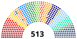 Há 513 deputados no poder. Os deputados são eleitos por representação proporcional . Isso é feito através da divisão de todos os votos pelo número de cadeiras disponíveis. O resultado é o quociente eleitoral. É importante notar que a parcela de votos de cada partido vem de sua quantidade de candidatos. Os votos para um partido específico são divididos pelo quociente eleitoral, e o quociente partidário é estabelecido. Esses cálculos são chamados de cota de Hare ou cota simples.[9]