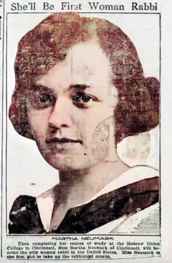 Em 1920, Martha Neumark foi admitida no Colégio da União Hebraica (HUC) do Judaísmo Reformador. Diz-se também que ela liderou serviços numa congregação em Frankfort, Michigan.[27] A sua admissão no programa rabínico do HUC resultou numa resolução de 1922 da Conferência Central dos Rabinos Americanos (CCAR) que permitiu a ordenação de mulheres; contudo, em 1923, o conselho de administradores do Hebrew Union College votou para proibir a ordenação de mulheres. Neumark retirou-se do programa rabínico após completar sete dos nove anos necessários para a sua conclusão.[28]