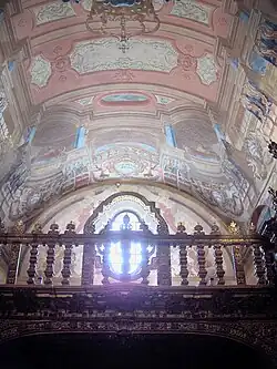 A talha ao longo das paredes laterais tem uma decoração marcada por motivos fantásticos e vegetalistas, embora sem uma relação aparente de continuidade.[7] Com efeito, as figuras celestiais surgem misturadas com animais grostescos, formando um cenário caótico típico do barroco, que se distingue pelo exagero e pela deformação do natural.[7] As figuras míticas incluem querubins que funcionam como atlantes, e serafins coroados de rosas que seguram açafates.[7] Foram igualmente representadas várias cenas de guerra e da vida quotidiana, como a pesca, a caça, e a matança do porco.[7] No início da nave situa-se um coro alto, suportado por um arco abatido, e que possui uma balaustrada de pequenas colunas de planta quadrangular, com um parapeito.[7]