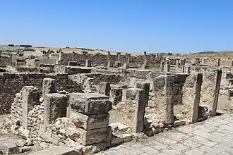 A entrada do sítio abre-se para um grande pátio pavimentado que conduz a uma porta interessante devido à sua estrutura, com corredores cobertos em ambos os lados. Nas partes laterais do pátio há lojas de cambistas e alguns baixos-relevos de génios. Perto da dessa porta encontram-se os restos de três templos dedicados a Ceres, Plutão e Apolo. Ali se encontram igualmente as ruínas de uma pequena igreja cristã, uma basílica com três naves e um batistério, junto a uma fortificação bizantina.[nt 1]