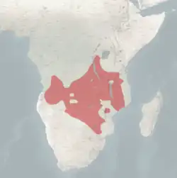 Pode ser encontrada nos seguintes países: Angola, Botswana, Burundi, República Democrática do Congo, Malawi, Moçambique, Namíbia, Ruanda, África do Sul, Tanzânia, Uganda, Zâmbia e Zimbabwe.[1]