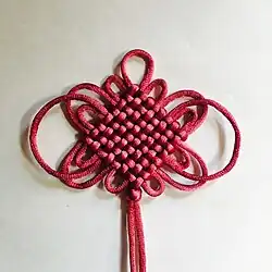 Nó chinês (chinês tradicional: 中國結; chinês simplificado: 中国结; pinyin: Zhōngguó jié), é uma forma de artesanato chinesa associada ao budismo e ao taoismo.[1] Cada nó é feito a partir de um único cordão tecido em formas variadas, cada qual com um significado simbólico.[2] A cor mais comum é o vermelho — símbolo de boa sorte na cultura chinesa —, embora outras cores também sejam utilizadas. Adereços como pingentes, contas e jade são frequentemente incorporados. Acredita-se que a arte dos nós tenha surgido originalmente como um meio de registrar informações e trocar mensagens antes do uso difundido da escrita. Tradicionalmente, os nós chineses atuavam como amuletos de boa sorte e proteção. Hoje, são usados para decorar casas durante festividades e também aparecem em joalheria e vestimentas tradicionais.[3]